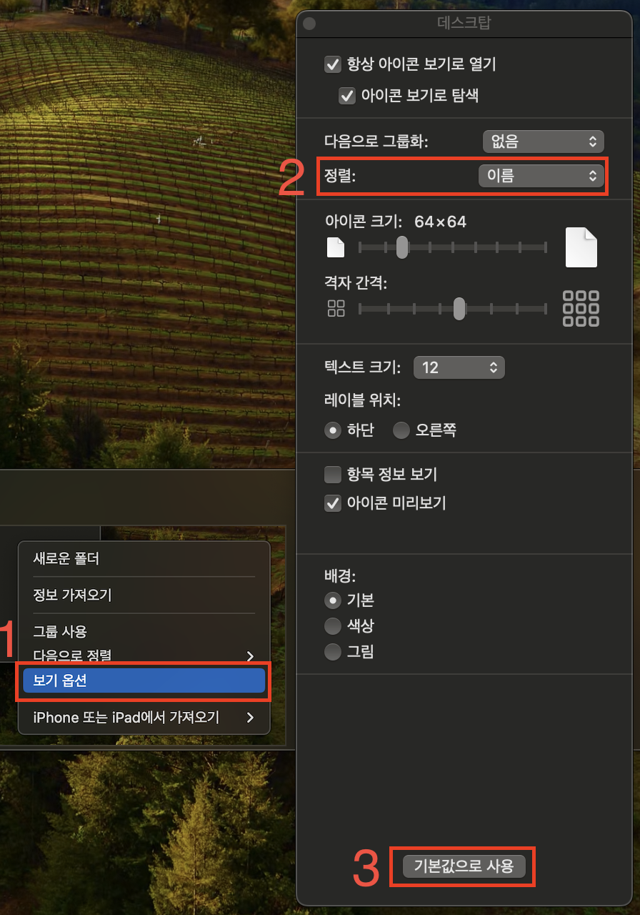 Finder 빈공간 우클릭 > 보기 옵션 > 정렬 > '이름'으로 설정 > 기본값으로 사용 클릭