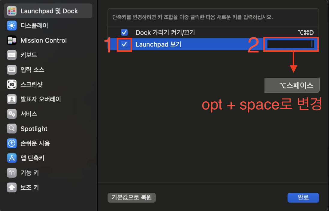 Launchpad 오른쪽 끝 부분을 더블 클릭해서 단축키 설정 (유튜브 그대로 따라해서 option + space로 변경)