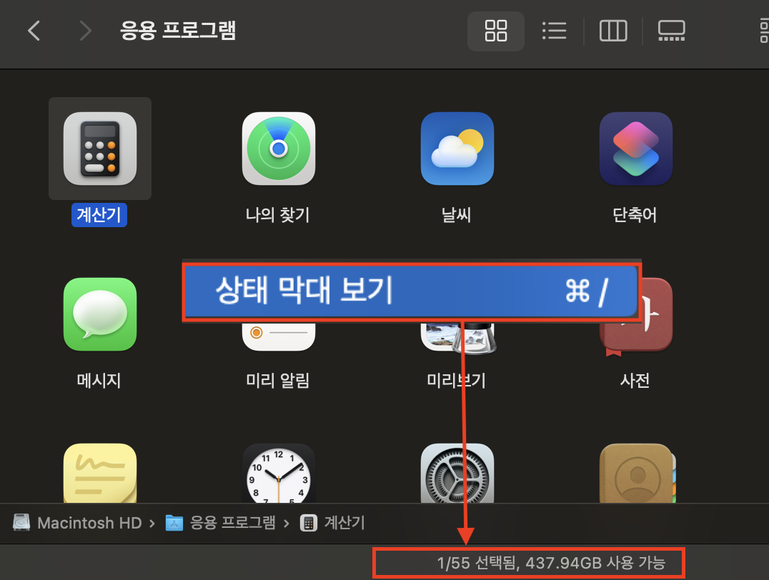 | Finder 상단 메뉴 > 보기 > 경로 막대 보기 | Finder 상단 메뉴 > 보기 > 상태 막대 보기 |