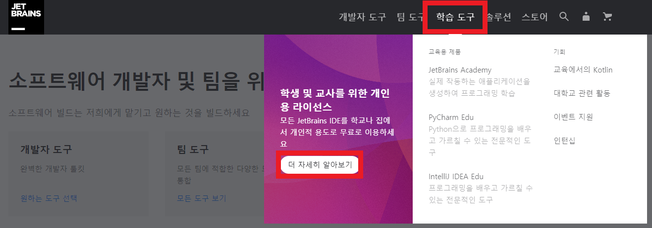 2) 사이트 헤더 > 학습도구 > 더 자세히 알아보기 버튼 클릭 하여 이동