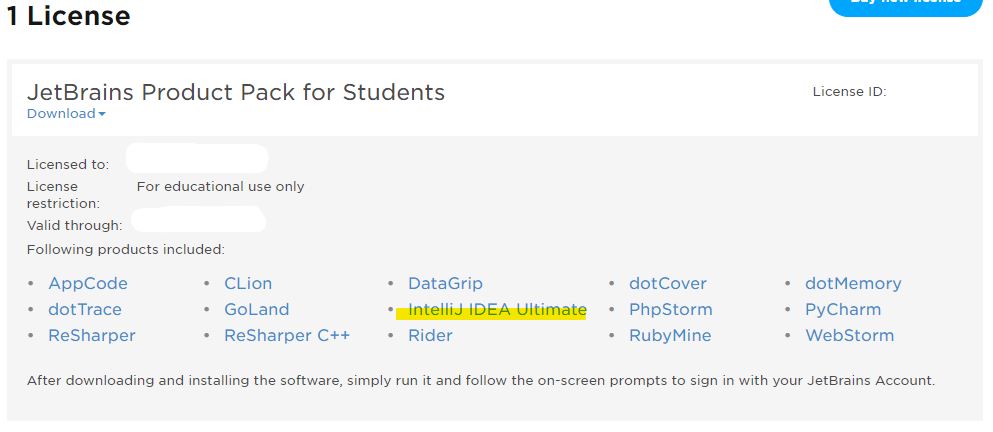 5) 회원가입이 끝난 후 로그인을 하면 나에게 할당된 라이선스가 아래와 같이 나온다. 그 중에서 'IntelliJ IDEA Ultimate'를 클릭